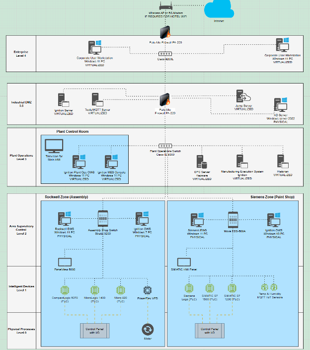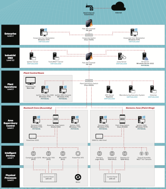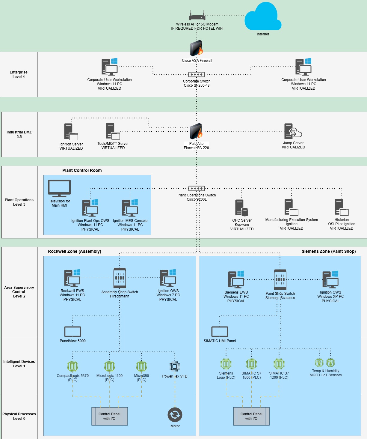 Pavilion OT System: A highly realistic manufacturing system. It include the MES, SCADA, HMI and PLC levels of the manufacturing automation stack. The primary vendors in the system are Inductive Automation, Rockwell Automation, and Siemens (see network diagram below).